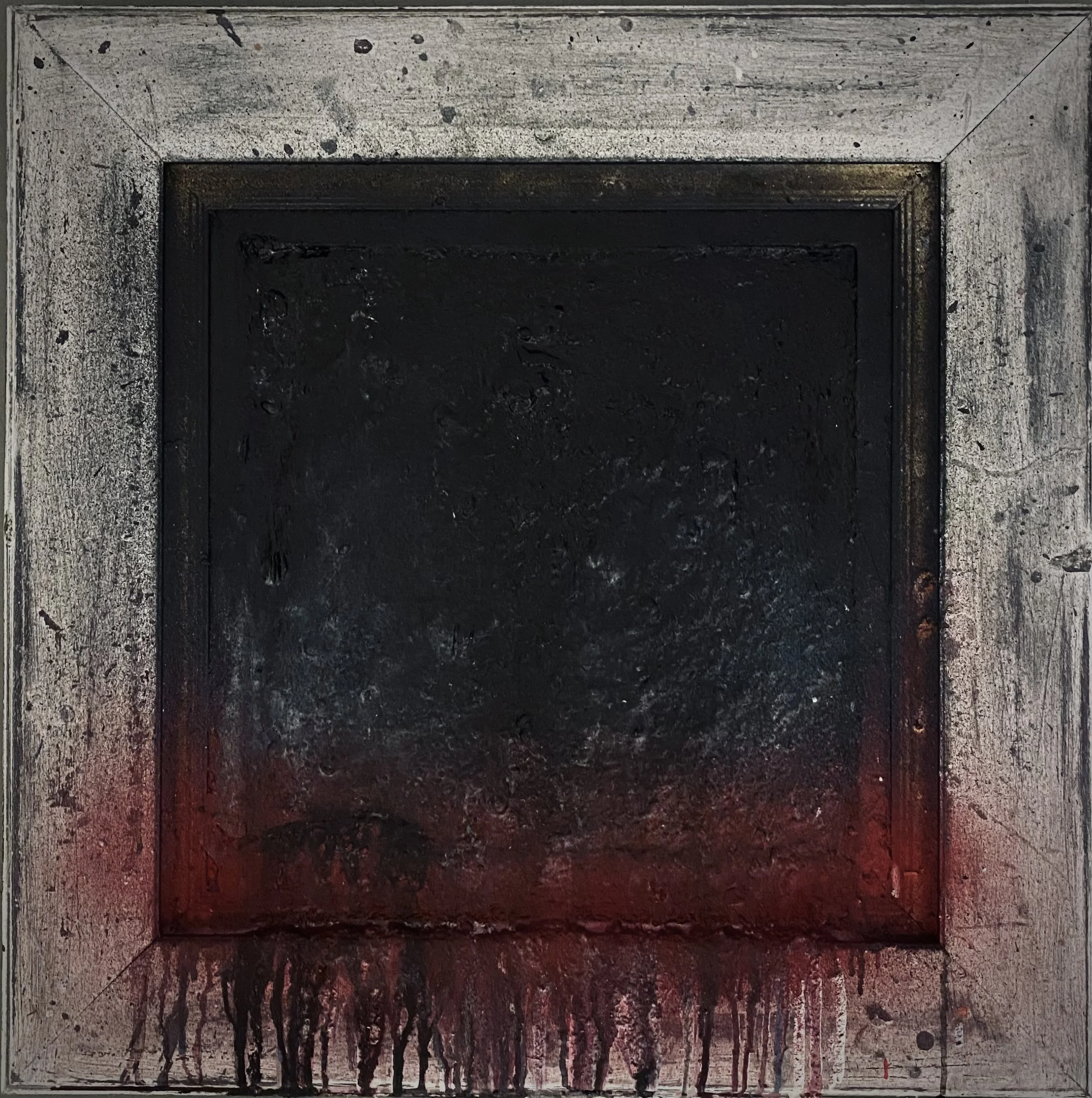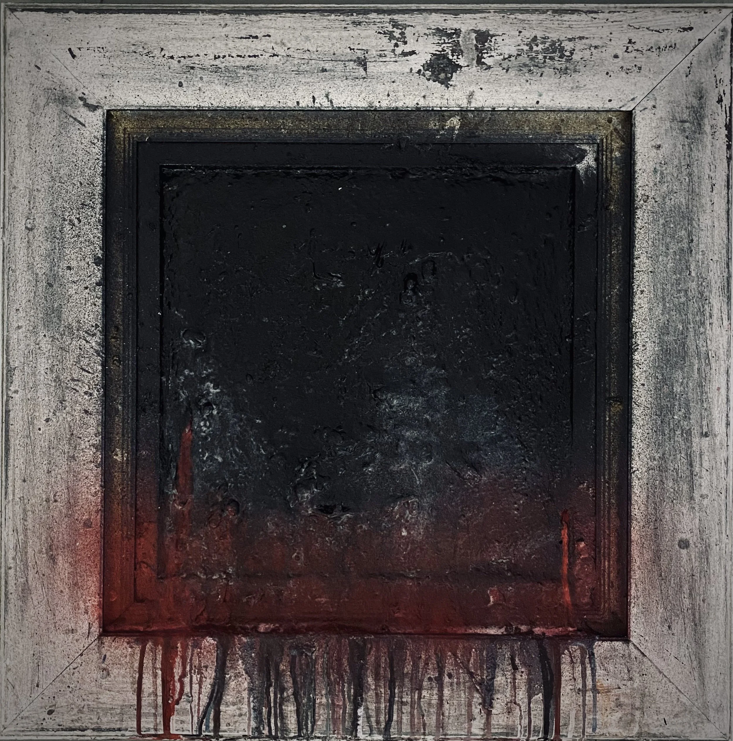 "Red Tide I" / acrylic paint, house paint , dirt, sand, gravel, etc. on canvas, in salvaged frame / 25.5 x 25.5 / 2024