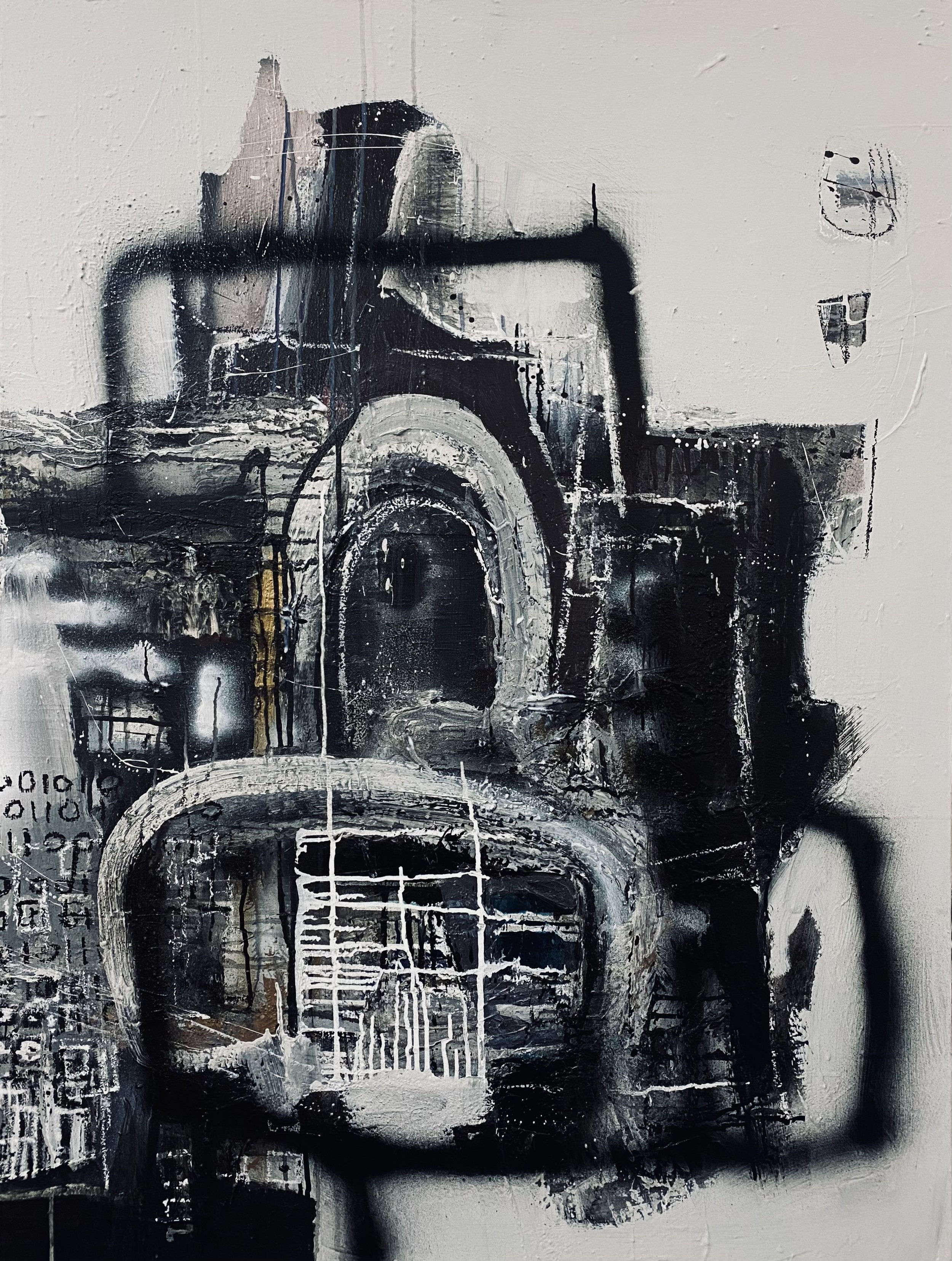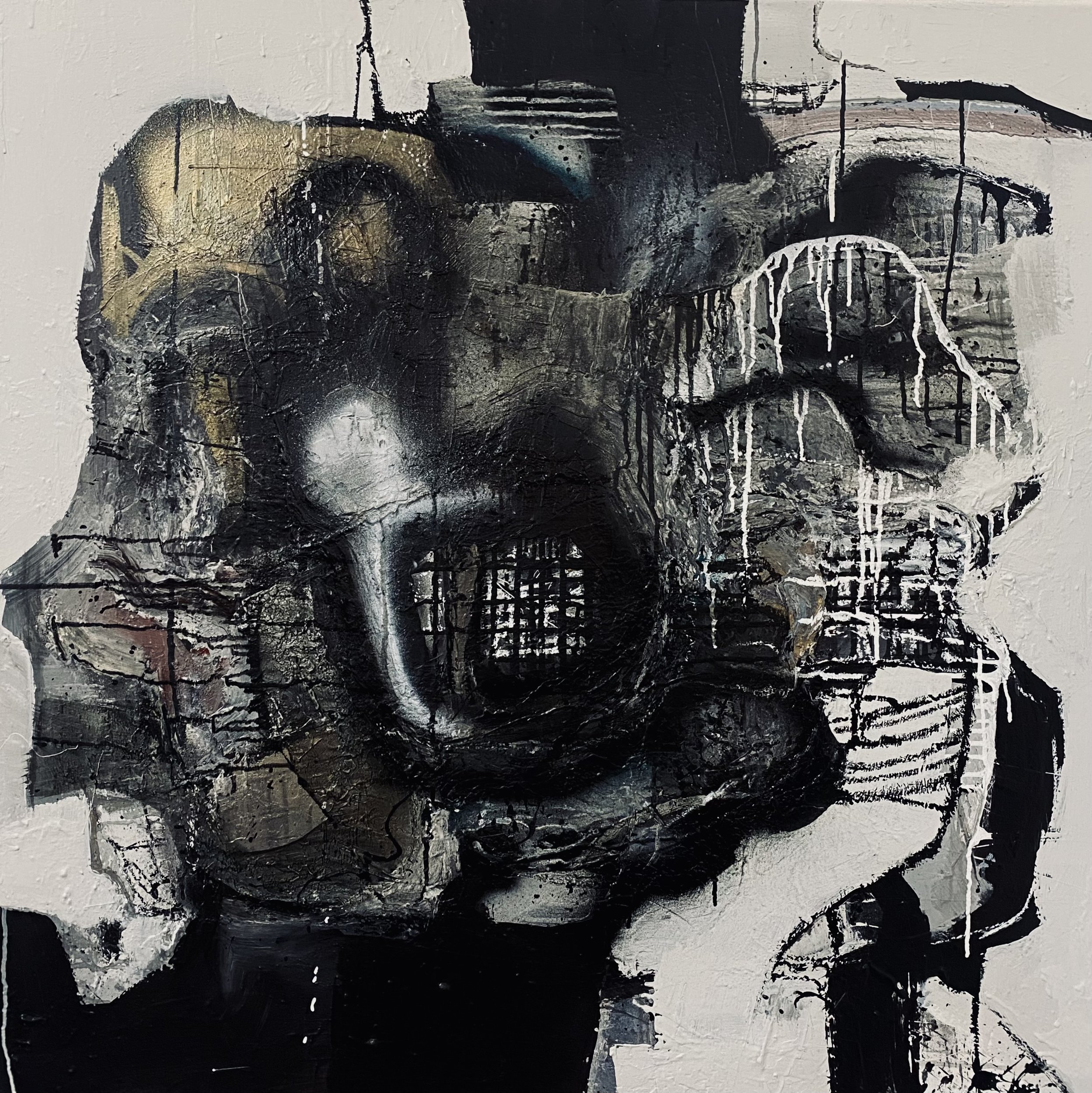 "Ruins I" / acrylic paint, house paint, paint stick, charcoal, and paper on paper / 22 x 22 in. / 2024