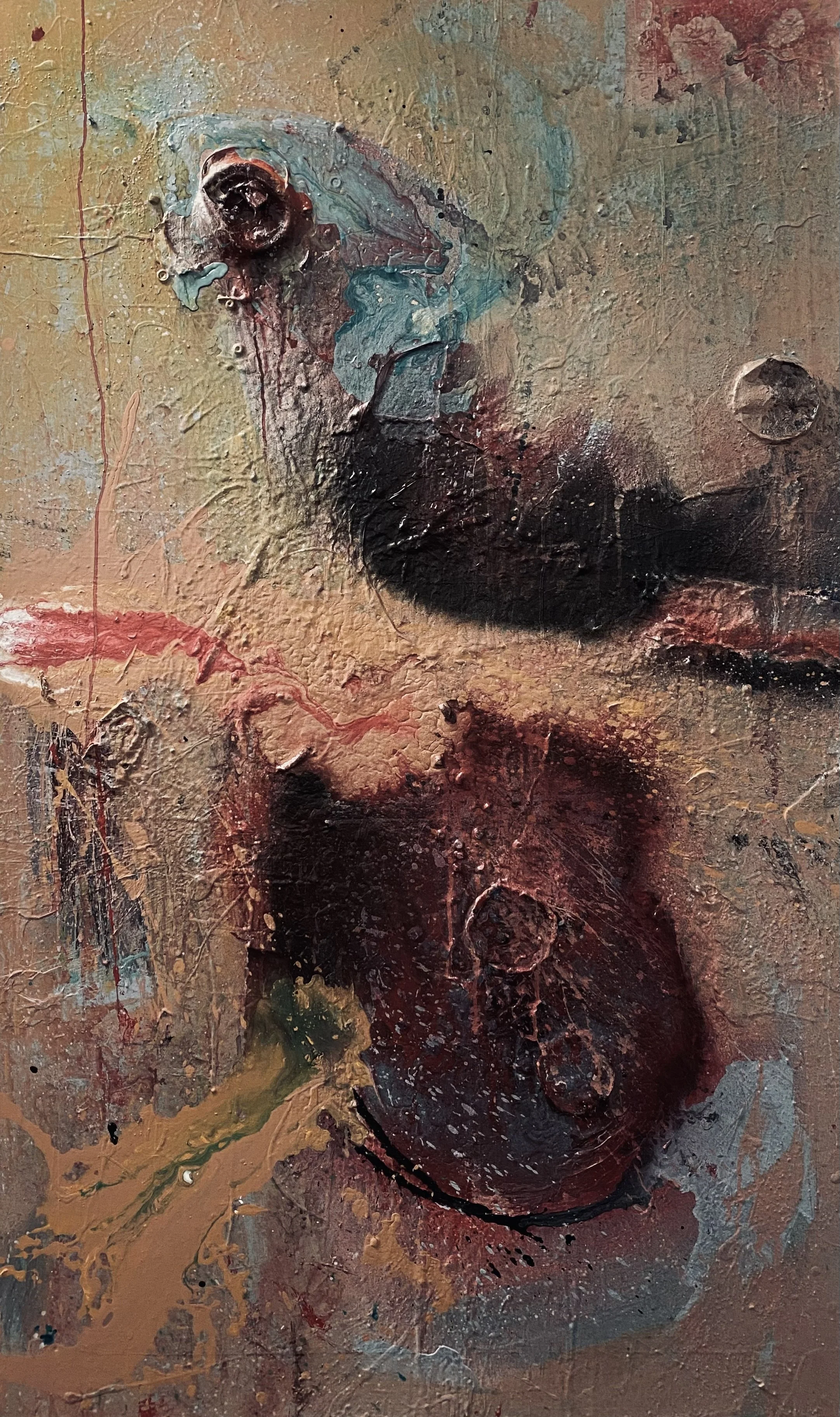 "It Wanted to Be Like Us" / acrylic paint, paint stick, house paint, hardware, wire, wood shards on canvas / 60 x 36 in. / 2024